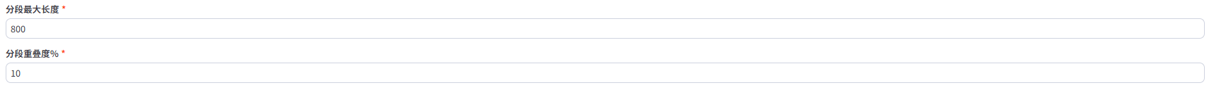 分段最大长度和分段重叠度大家选择默认的即可,这个最大长度是通用的,适用于大部分环境下的知识库文本