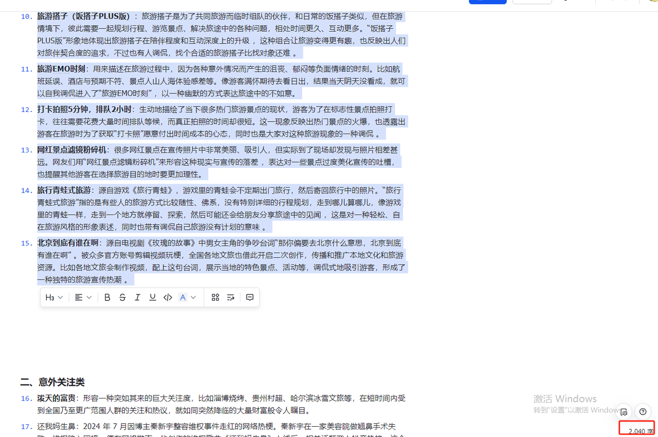 比如像我们这里,它的第一段文本长度就高达2040字,实在是太长了,需要我们手动的在文档中对它进行二次优化