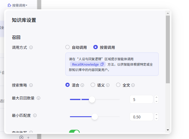 可以看到在人设与回复逻辑区域明确的规定知识库的调用规则之后