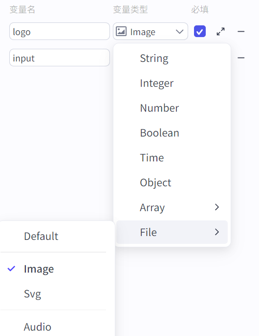用户的描述就是“input” “logo”的变量类型要选择为image,如图: