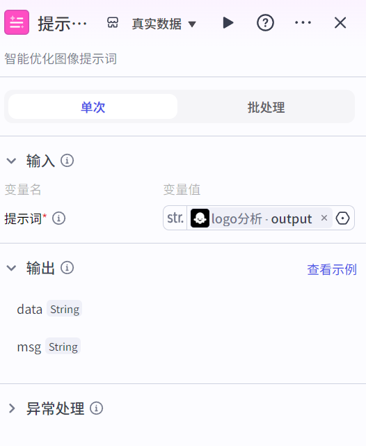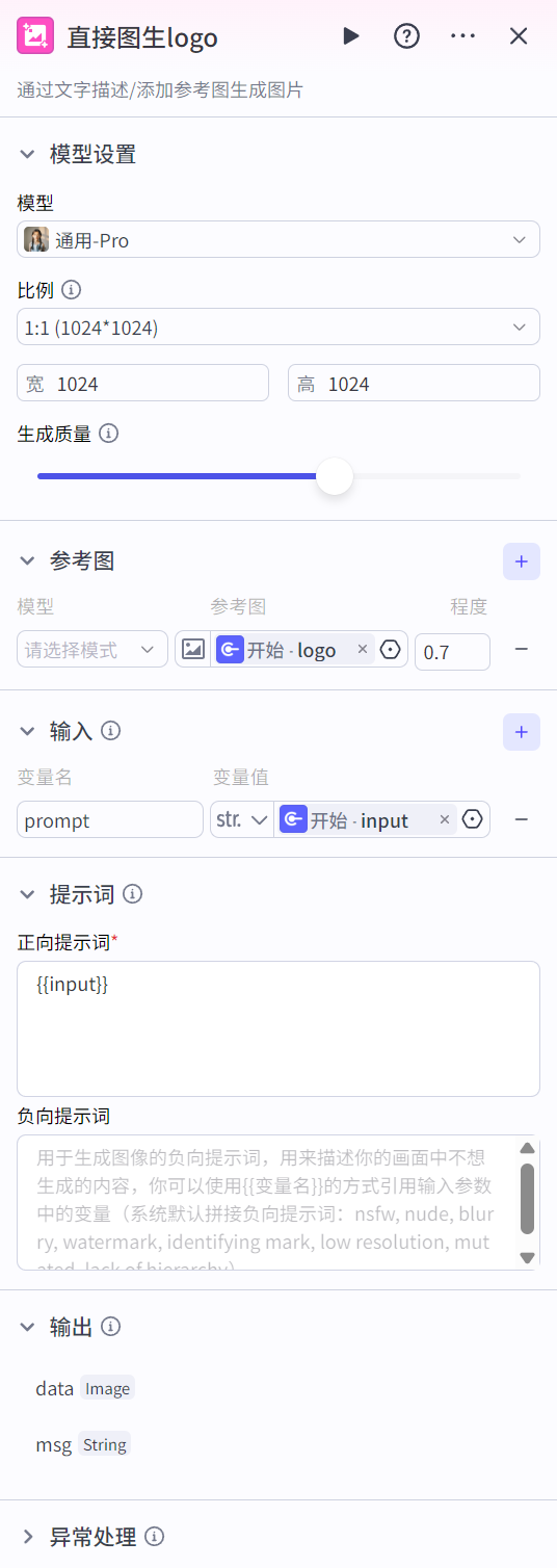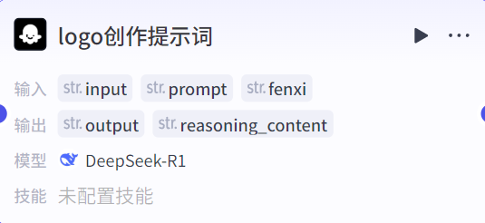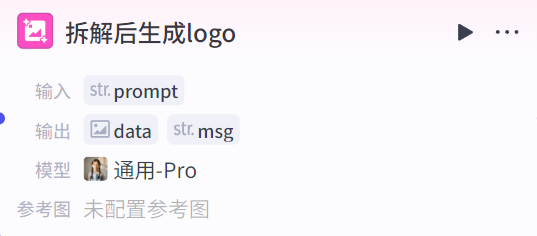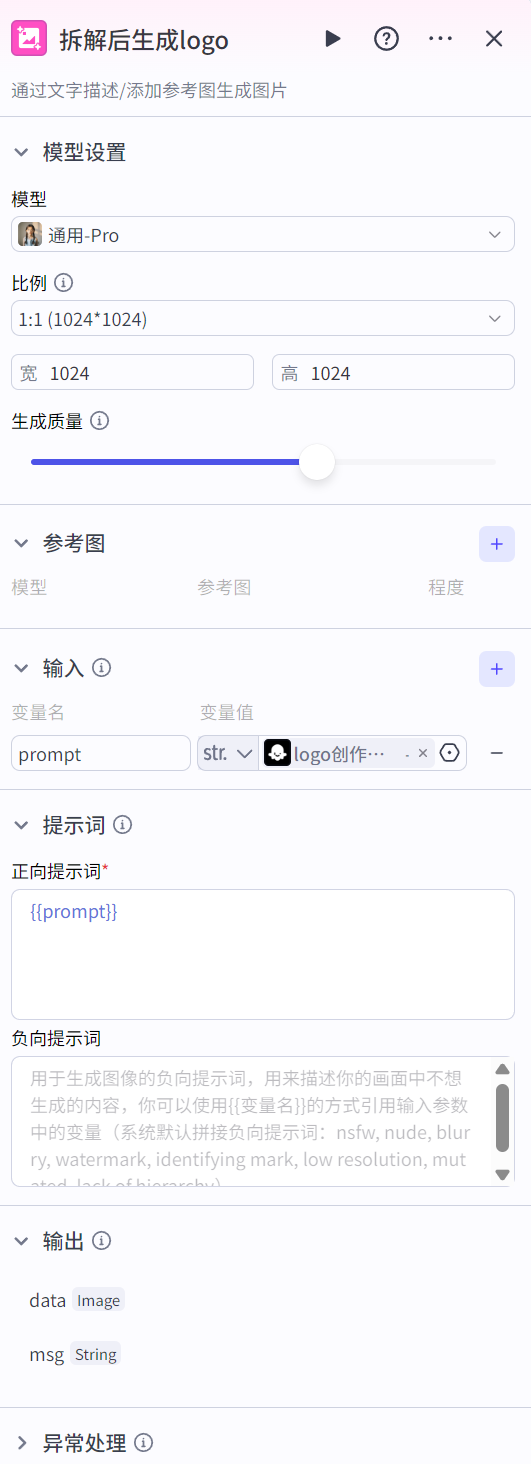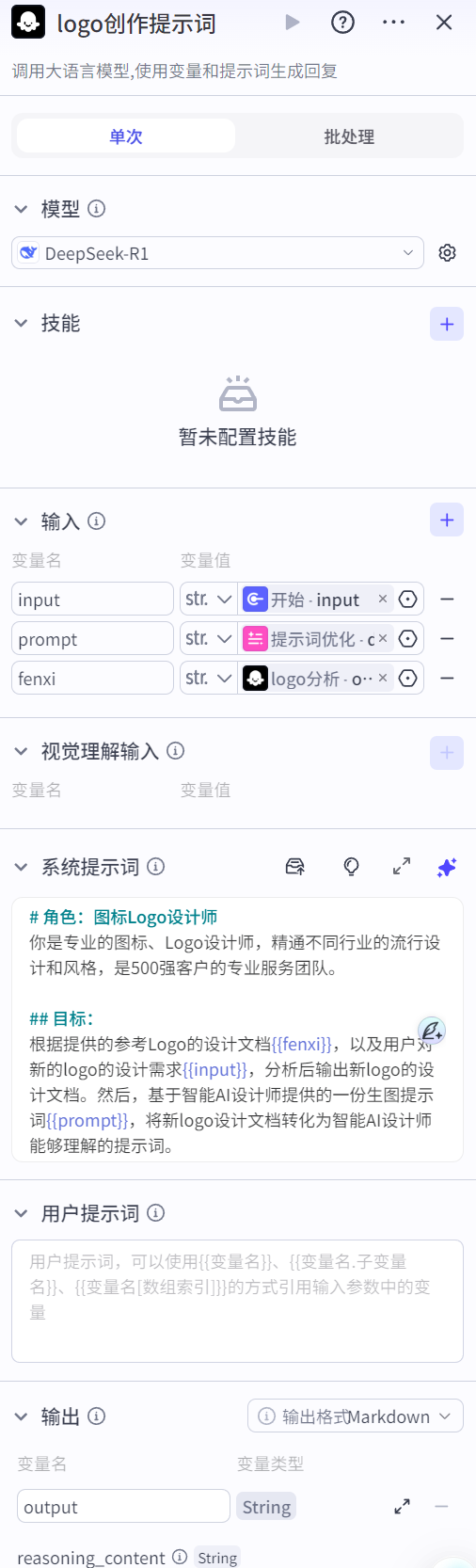 ![]() 输入就选择上一个“logo创作提示词”输出的提示词内容,变量命名为“prompt”
