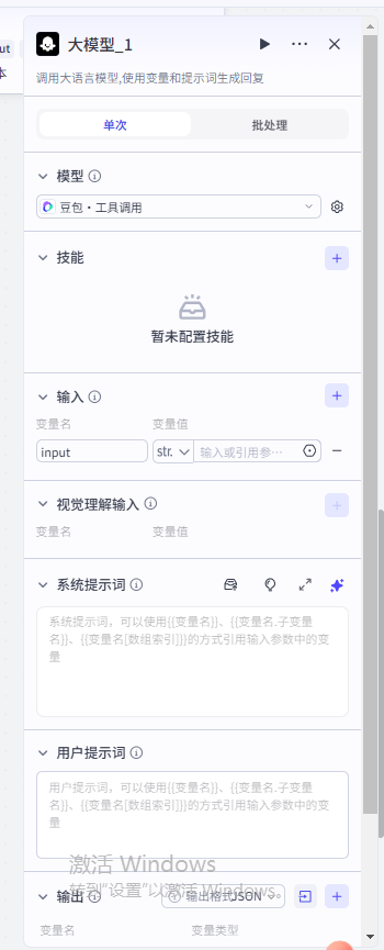 工作流节点的大模型节点也是一个单独的节点,支持提示词的撰写、技能的配置