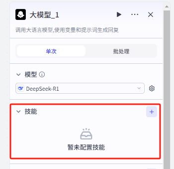 除了上面的基础设置,在工作流节点中,大模型也是支持技能的设置的