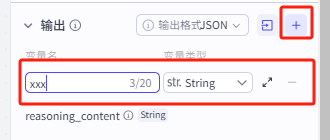 然后我们再看输出部分,正常的大模型输出节点是没有输出变量的,需要我们自己点击添加进行定义