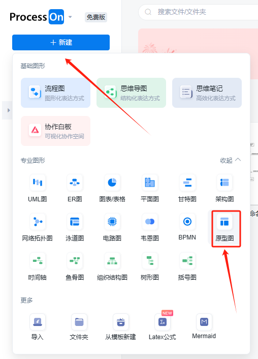 登录进入网站之后,我们点击左上角的新建,然后在专业图形部分找到原型图,点击一下