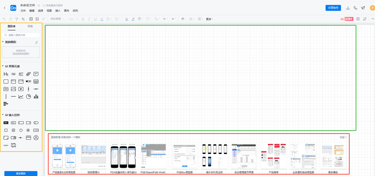 进入画板界面之后可以看到,我们能够使用模板新增原型图(红色区域),也可以直接选用左侧的控件进行元素的添加(黄色区域),而中间空白的绿色区域就是我们的编排画板
