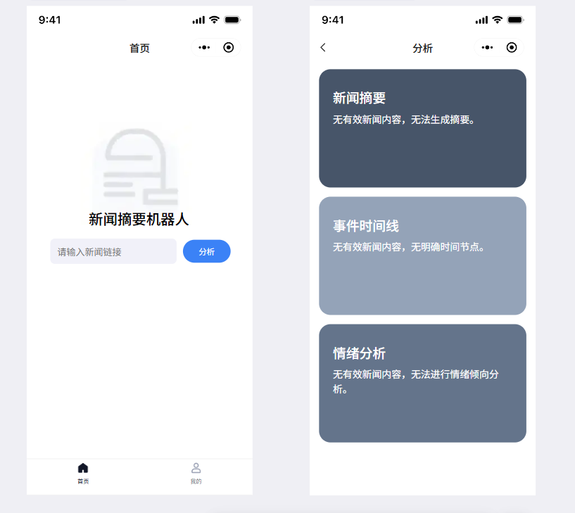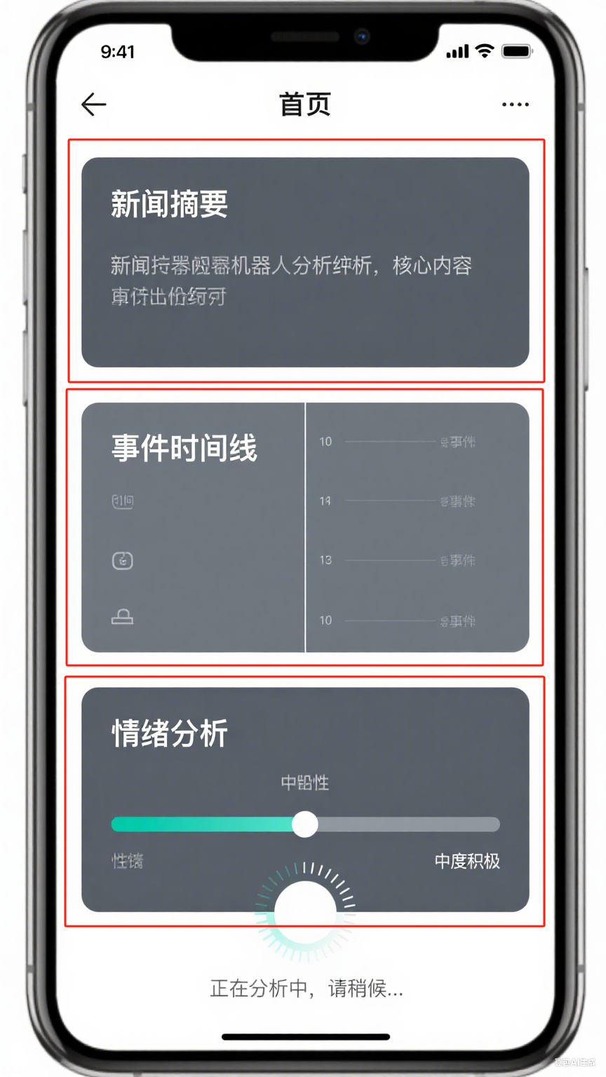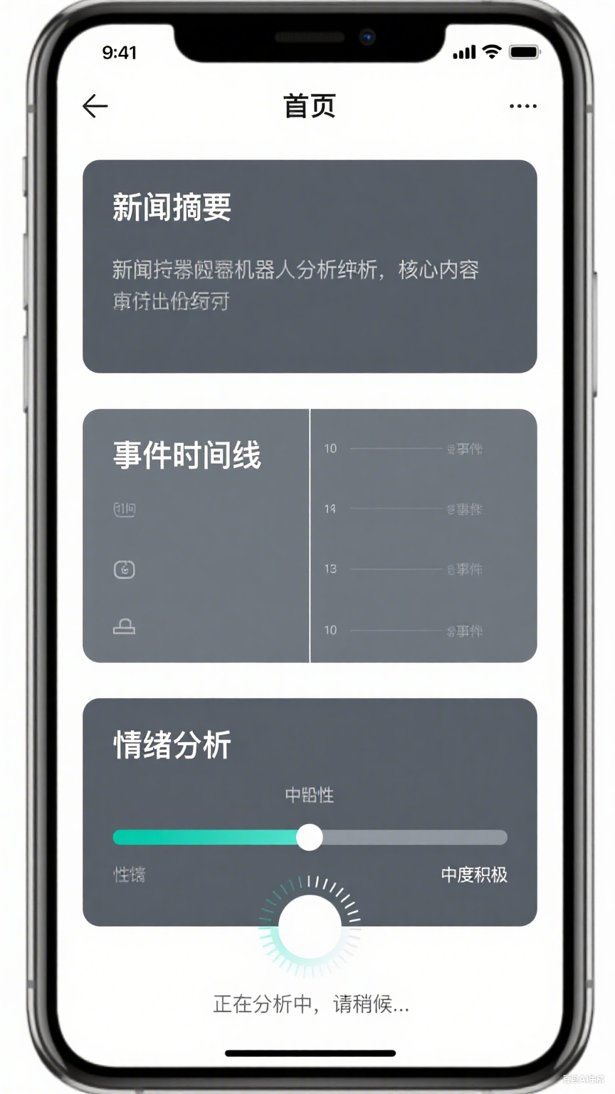 用户点击“分析”后,稍等片刻,看到一个清爽的结果页面。三个醒目的卡片整齐排列:第一个卡片用几句话概括了新闻;第二个卡片像一条时间轴,清晰列出了事件发展步骤;第三个卡片有个直观的进度条,一眼就看出这条新闻整体是偏积极还是消极。整个页面看起来条理分明,重点突出,用户能快速获取所需信息。