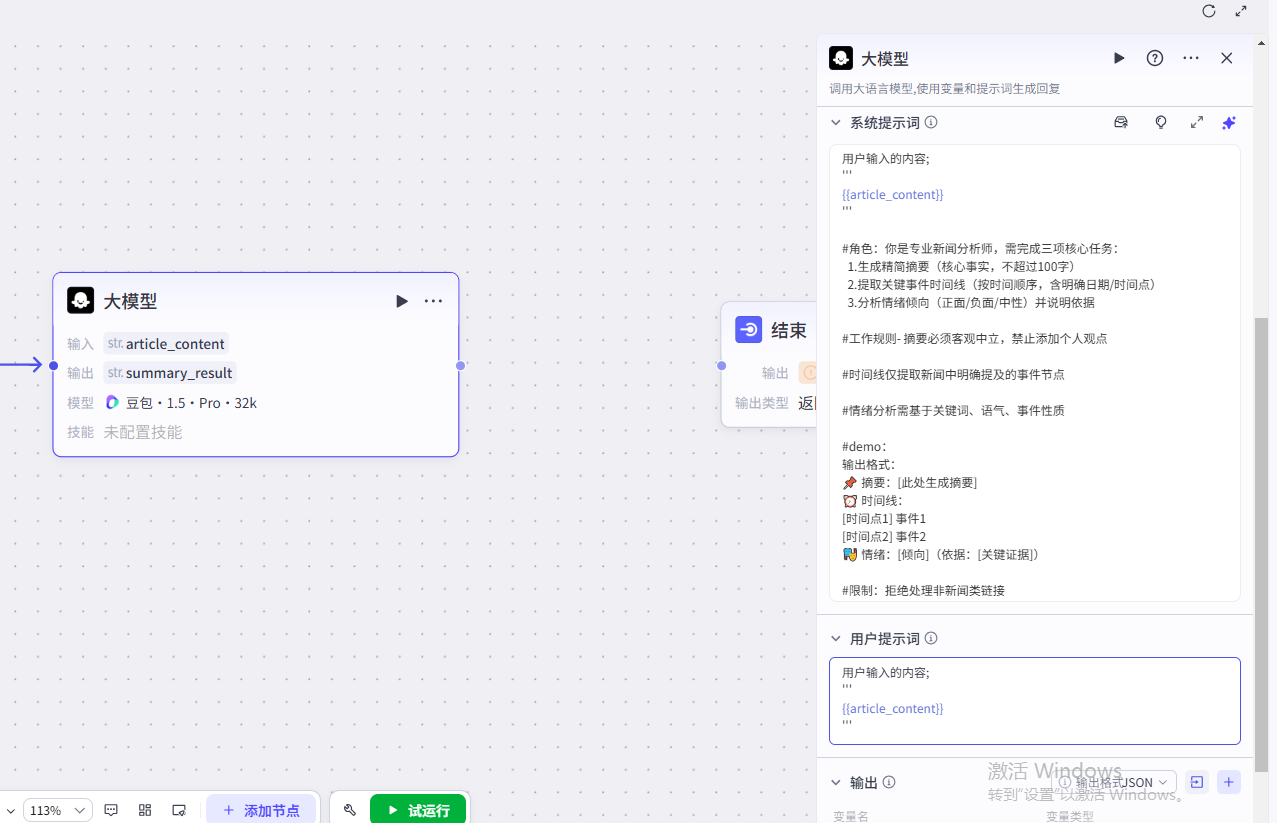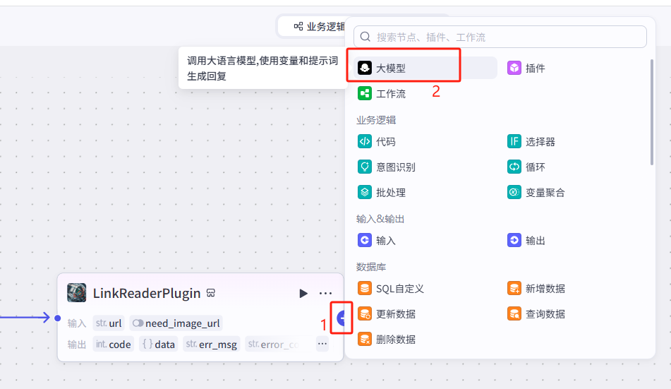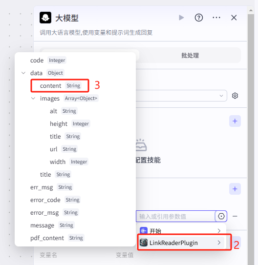 连接网页提取节点 → 选择 大模型节点