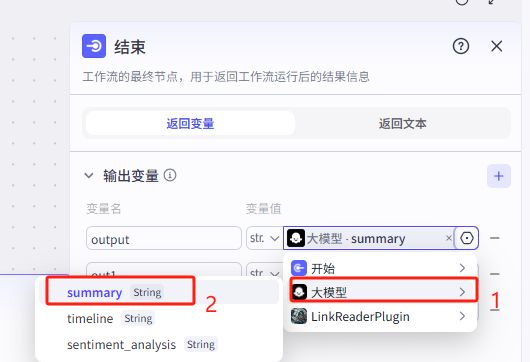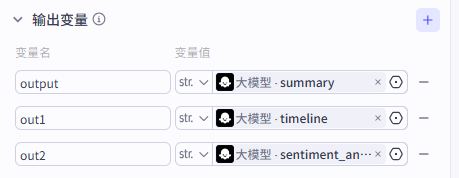 这部分的设置逻辑也很简单,就是把这三个容器内的文本内容链接为工作流的输出变量而已