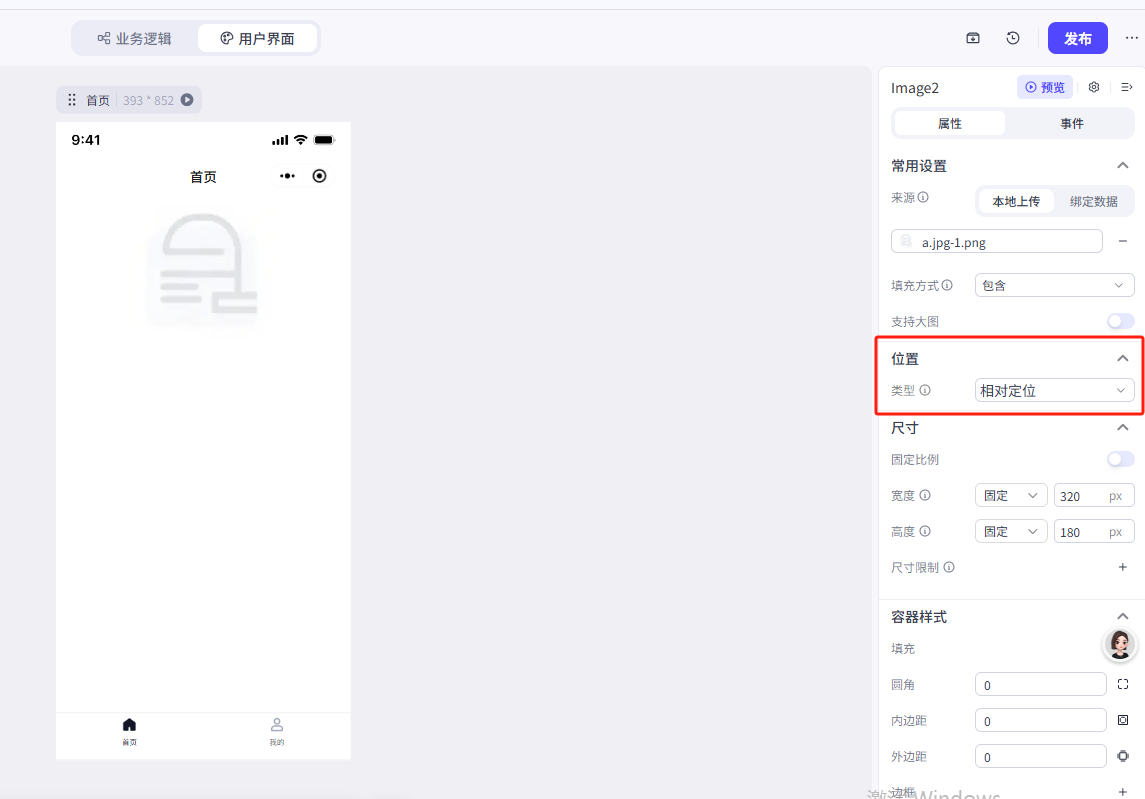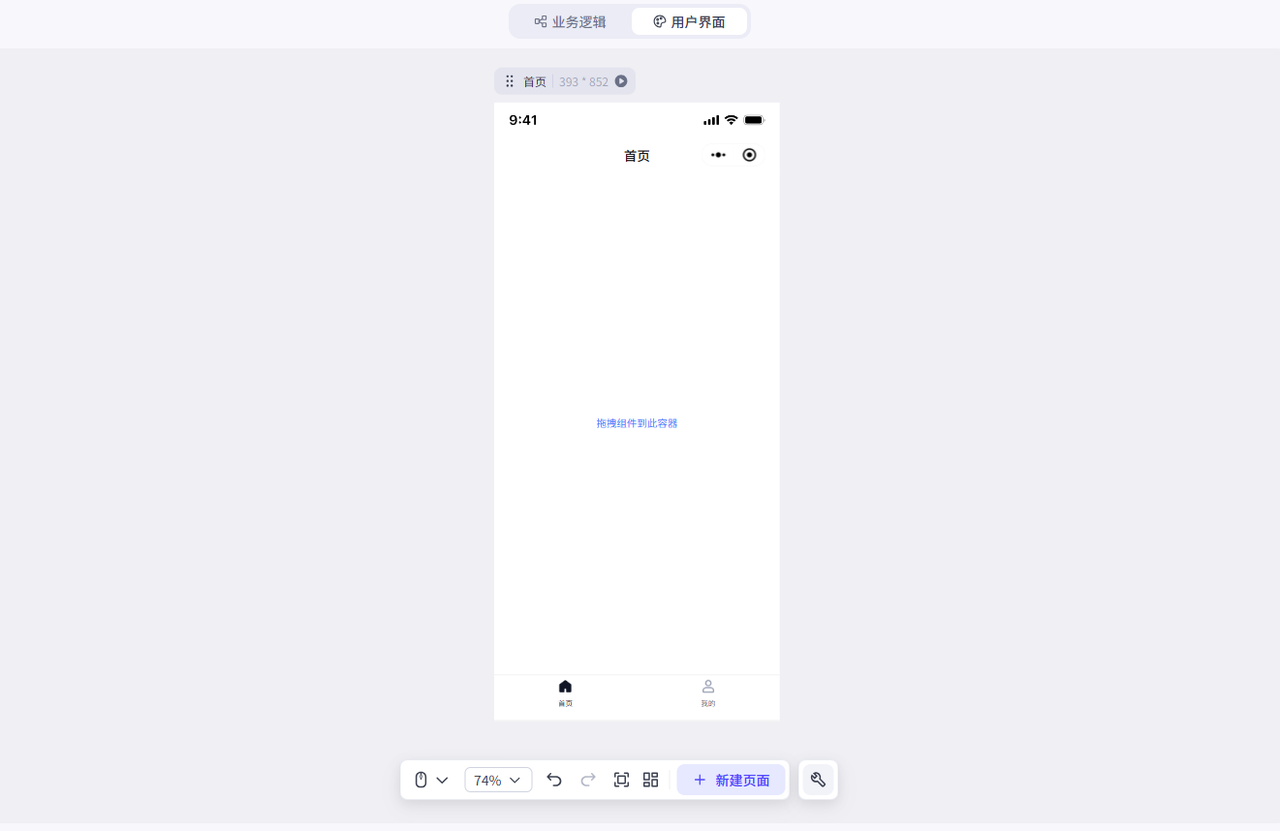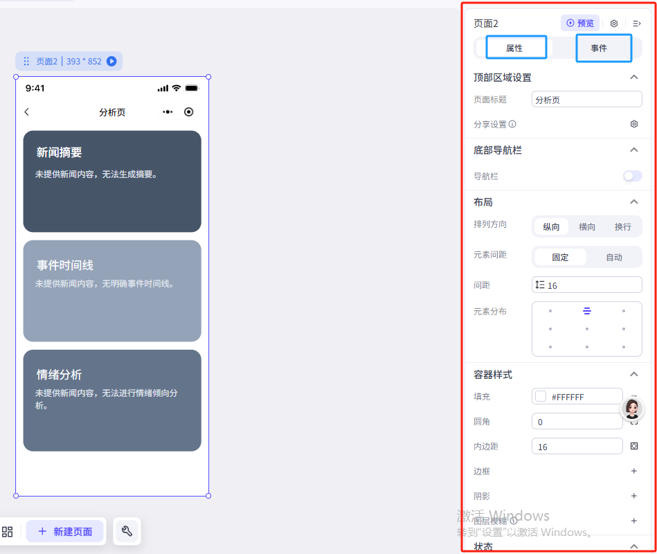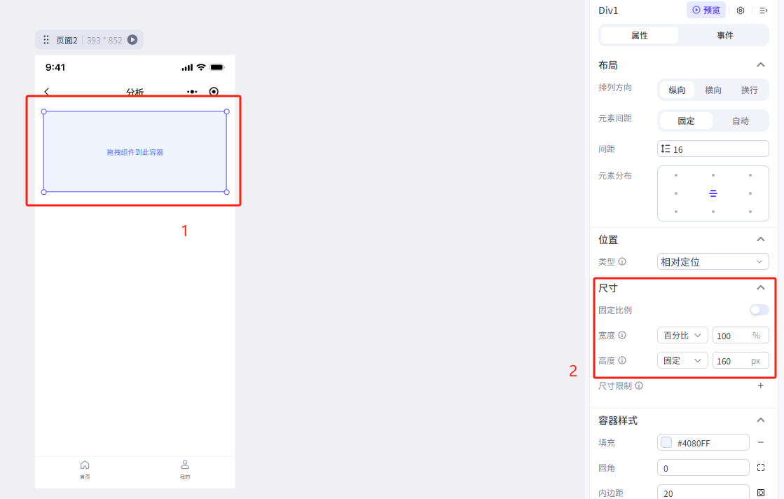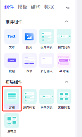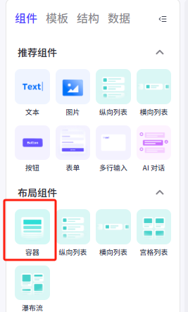 在左侧的组件菜单找到布局组件——容器,把他拖动到页面上