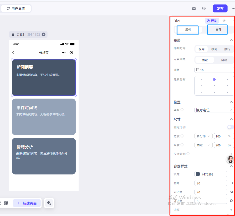 耐心等待测试完成,分析页出现了新闻摘要、事件时间线、情绪分析等内容,说明我们的应用无误,测试成功!