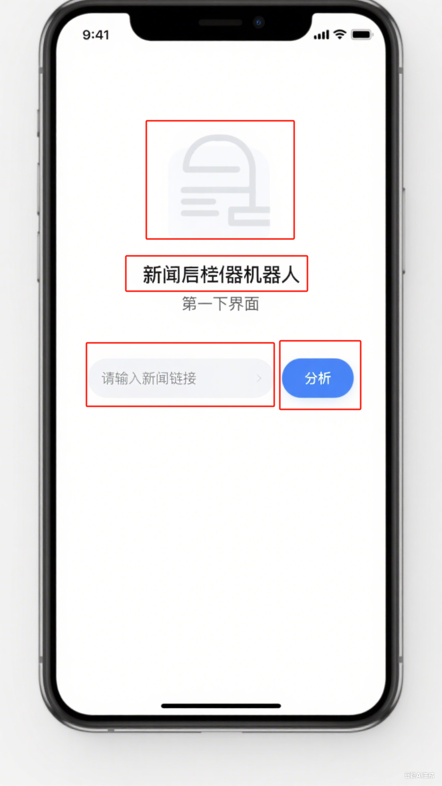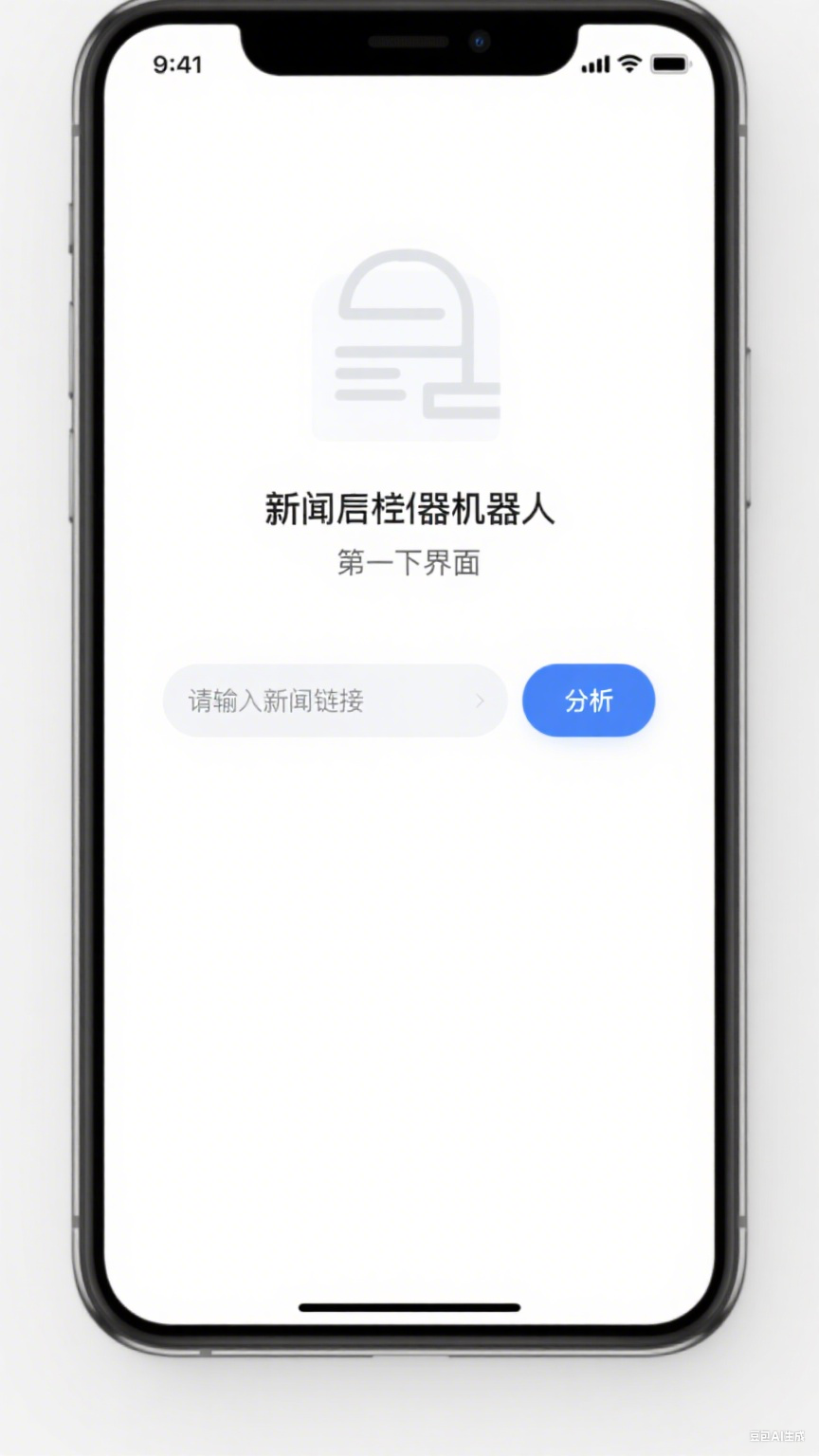 第一个界面配备一个简单的图形在上部展示,然后是设计一个简洁的输入框,用于用户输入新闻链接。输入框旁边可以添加一个提示文字,如“请输入新闻链接”,让用户清楚知道该输入什么。在输入框旁边添加一个“分析”按钮,用户输入链接后点击该按钮,机器人开始对新闻进行分析。按钮的颜色可以选择醒目的颜色,如蓝色,以吸引用户的注意力。