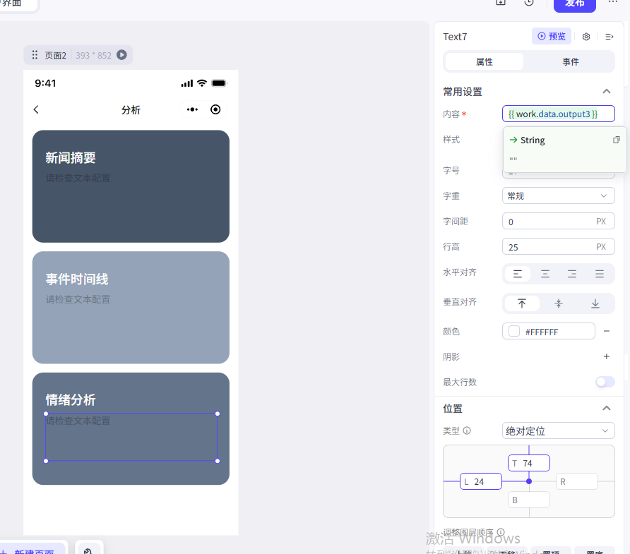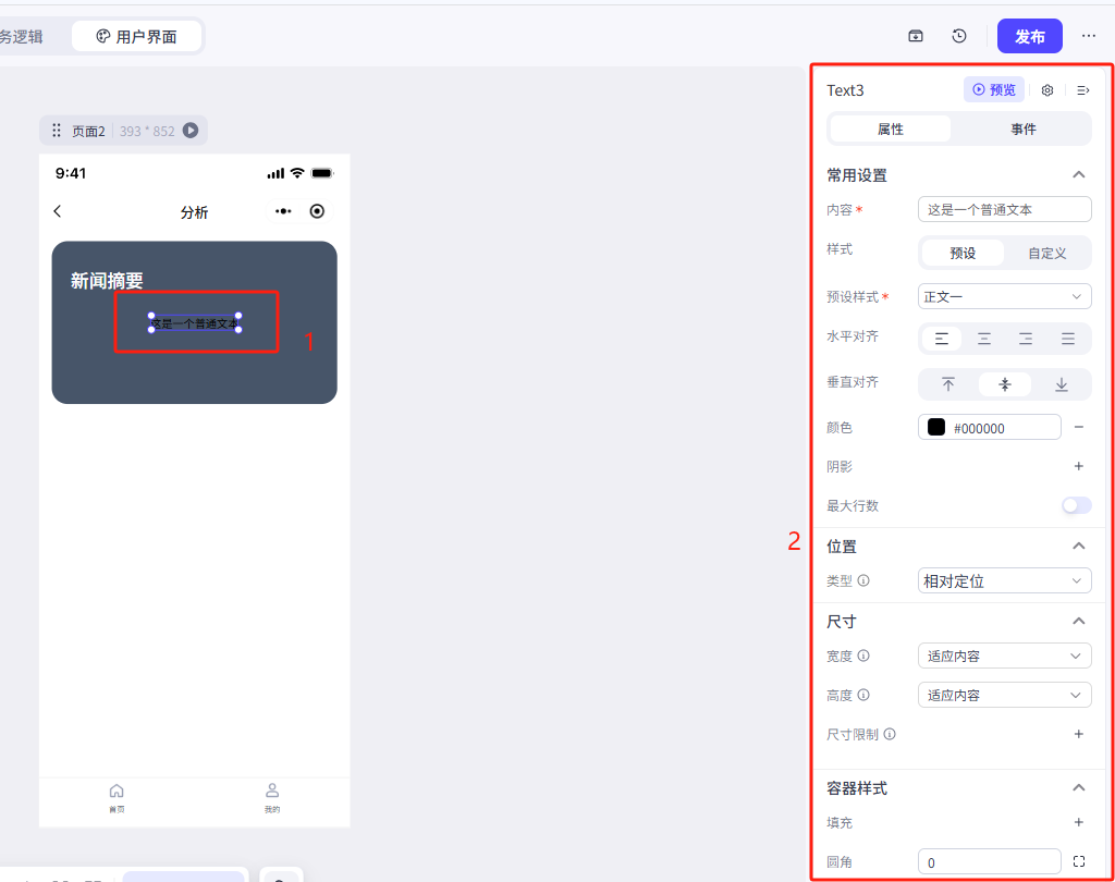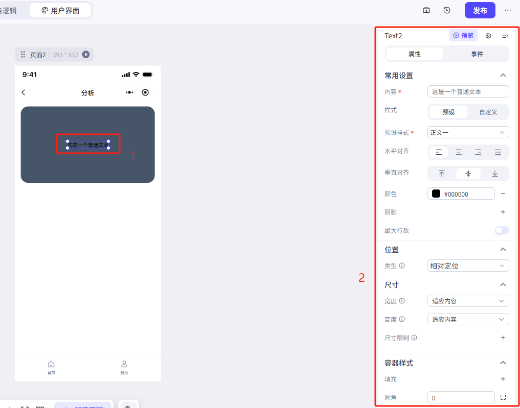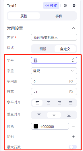 我们这里修改了文本大小、颜色、对齐方式、文本的位置(位置类型修改为绝对定位)、文本尺寸、容器演示-溢出设置