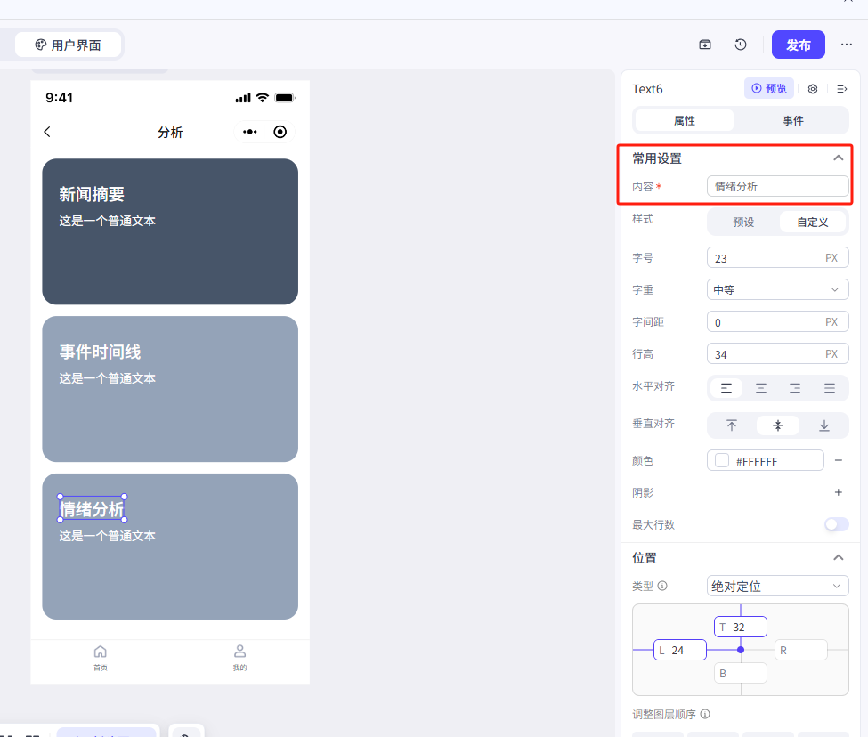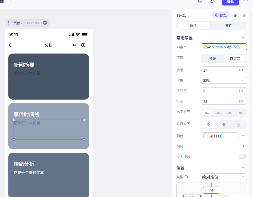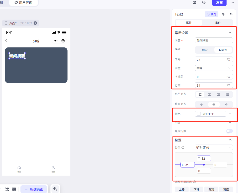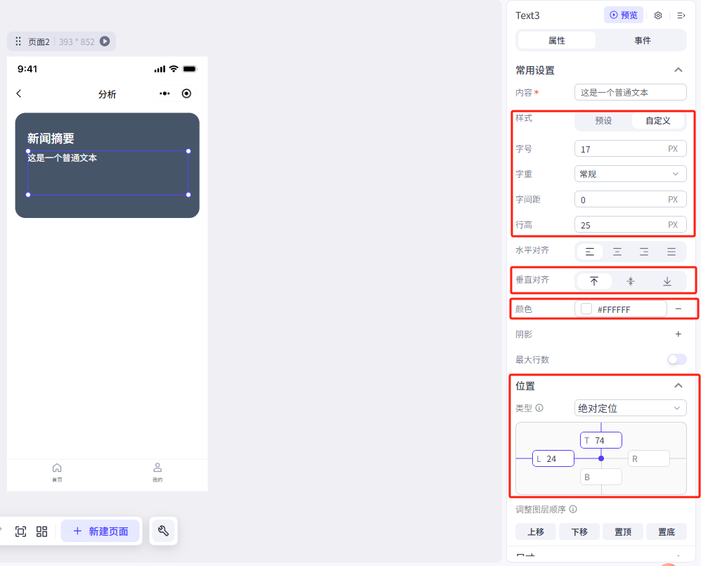 我们这里修改了文本内容、大小、颜色和文本的位置(位置类型修改为绝对定位),大家可以参考一下我们的参数