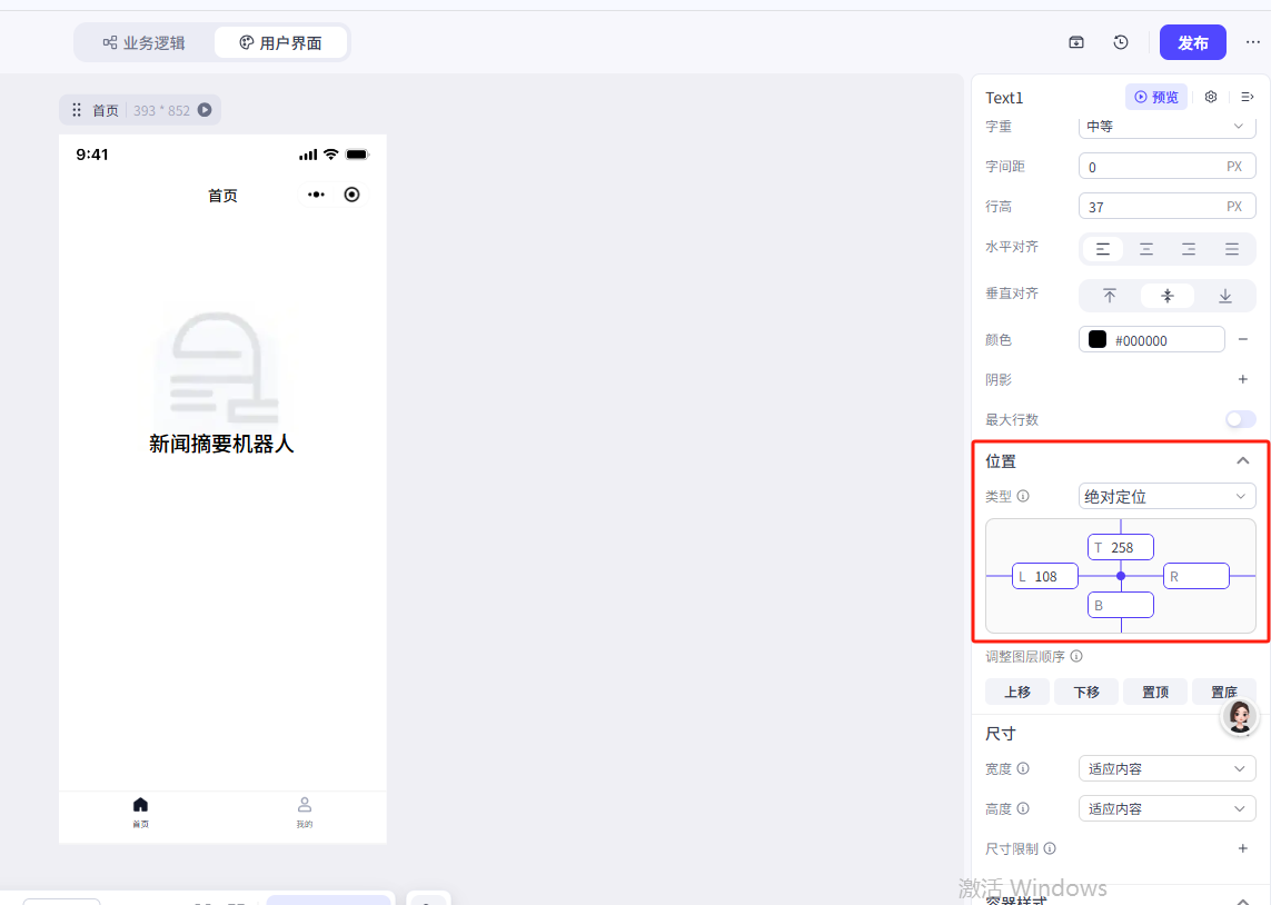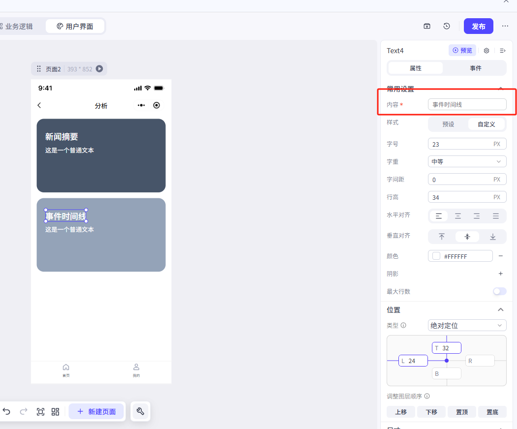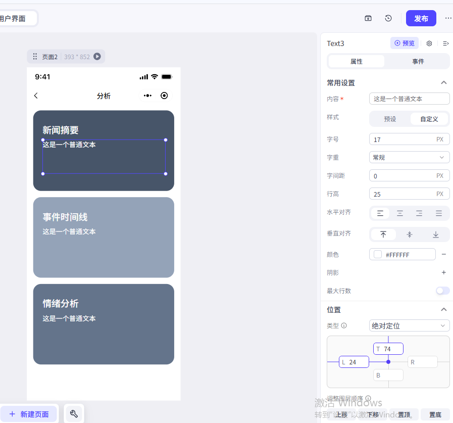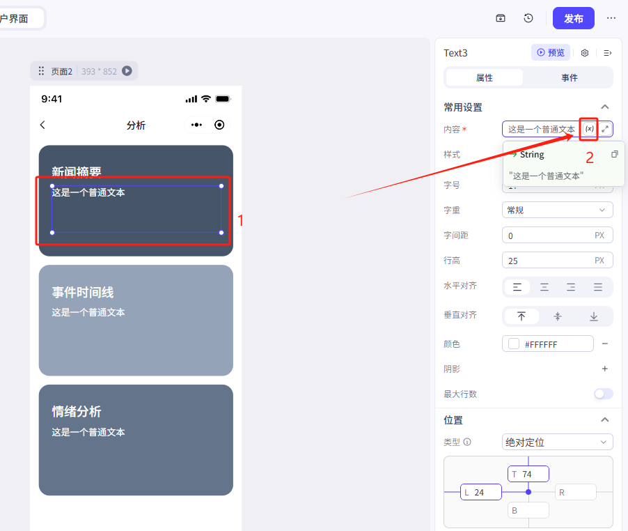 我们这里修改了文本内容、大小、颜色和文本的位置(位置类型修改为绝对定位),大家可以参考一下我们的参数