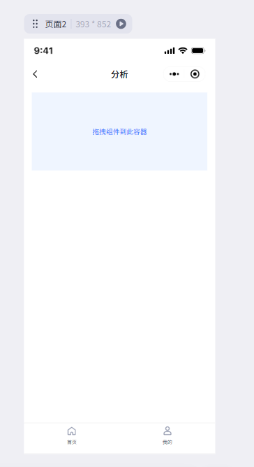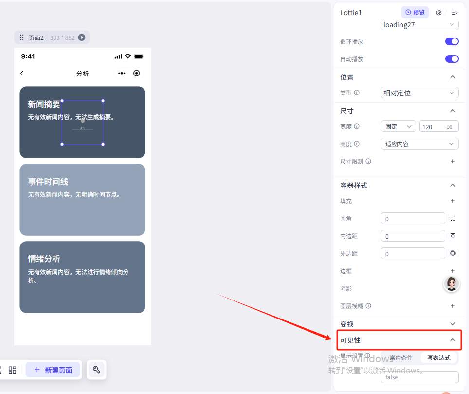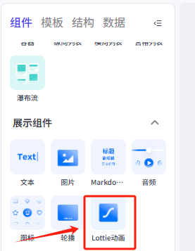 我们在左侧菜单的展示组件部分,找到Lottie动画,把他拖动到分析页上的第一个容器里