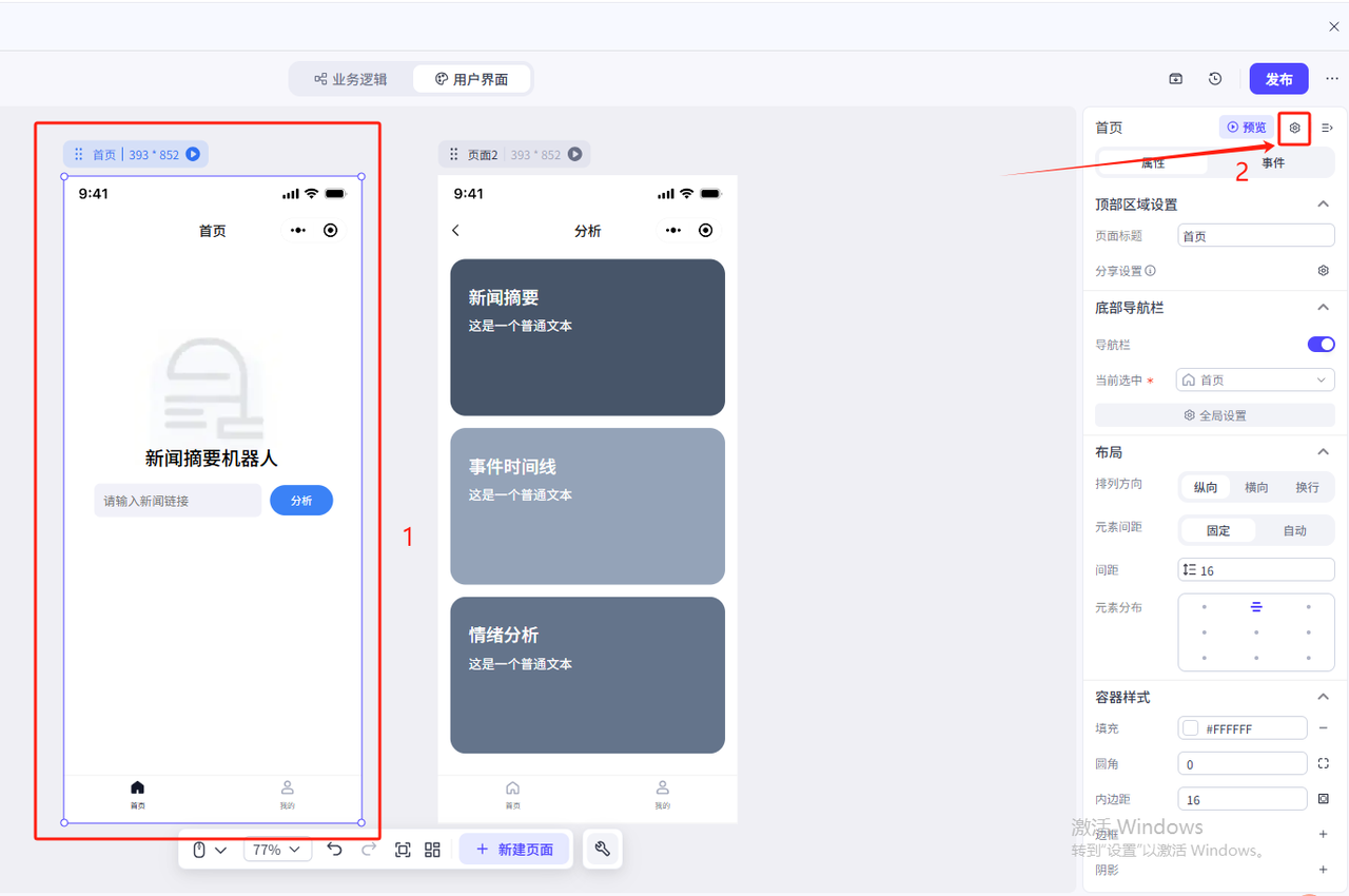 可以看到画板上已经出现了两个界面,接下来我们在上面进行更改,完成自己的界面设计