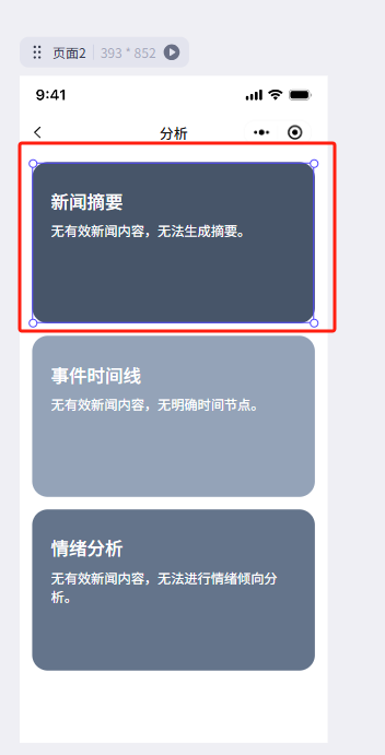 三个卡片 从上到下垂直排列 (摘要 -> 时间线 -> 情绪分析)。