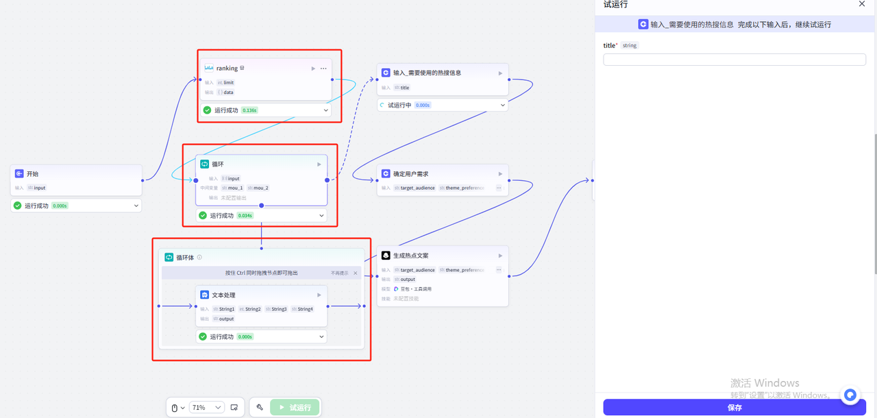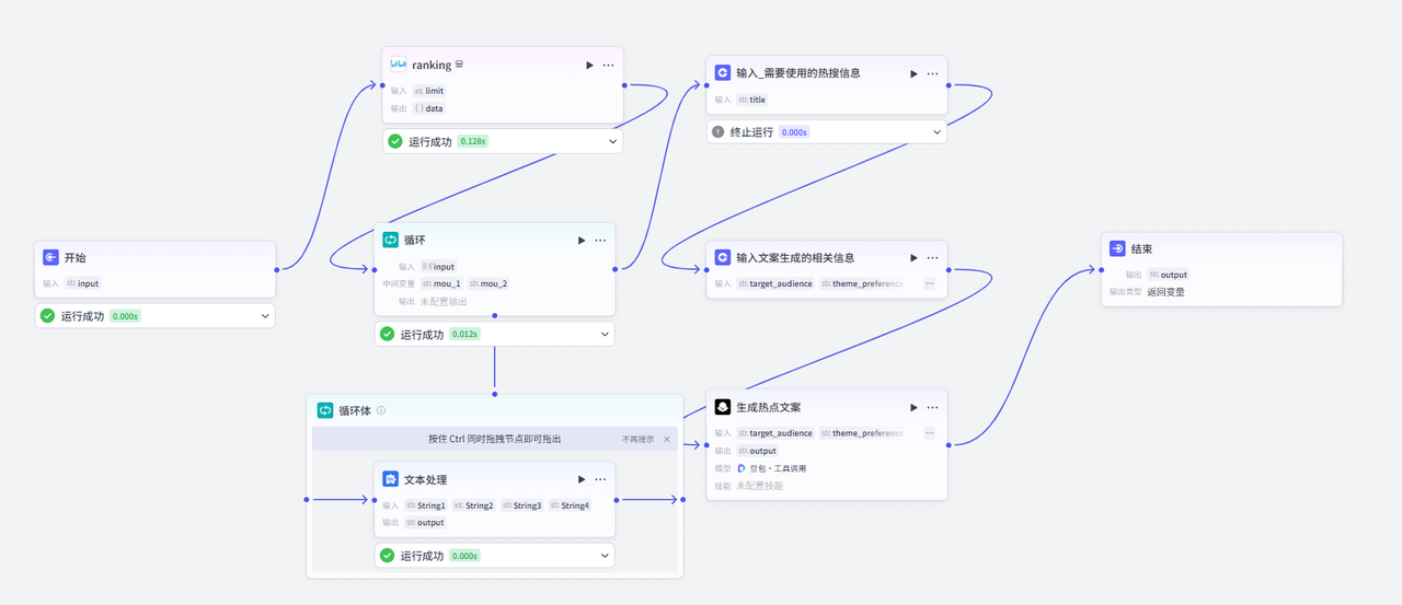 我们这个时候可以回去查看下文本处理节点的输出,选择一个想要使用的热搜标题