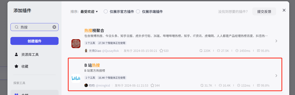 因为是以B站的热搜为例,所以这个工作流主要用到插件市场的“B站热搜”插件
