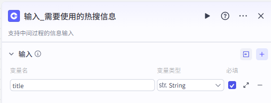 前面有提到过,这里为了方便用户定制化的需求,采用输入节点来设置,如果热搜标题中没有用户想要的标题,那么他自行输入也是ok的