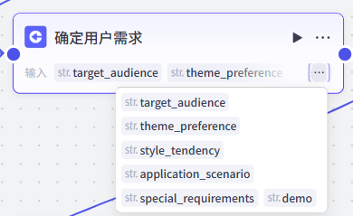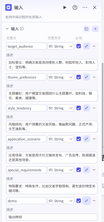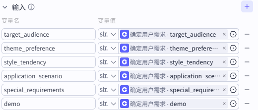 这个节点的配置就要复杂一些,需要我们将前面输入节点的所有输入都添加一遍,方便后续在提示词中进行引用