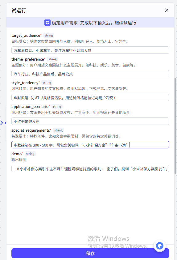 为了实现个性化的定制需求,需要在最初接收用户输入的时候加入一个信息接收节点,让用户按照我们的提示框输入变量,方便在后续的生成文案大模型中进行个性化的生成
