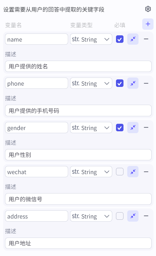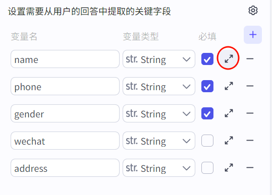 然后红圈的展开按钮,每个变量写一下描述,这样在AI追问的时候可以更准确地追问并采集信息