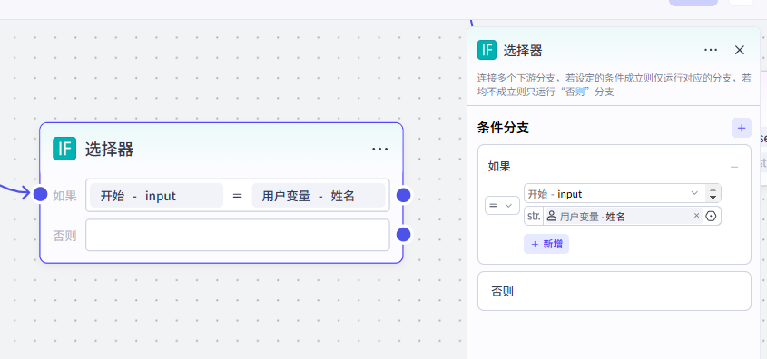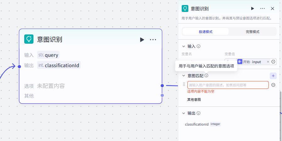 选择器在处理用户输入的时候,更多是用等值的方法去辨别,分支也只有是或否两个结果,适合处理比较简单的辨别问题,复杂的情况就需要使用意图识别节点