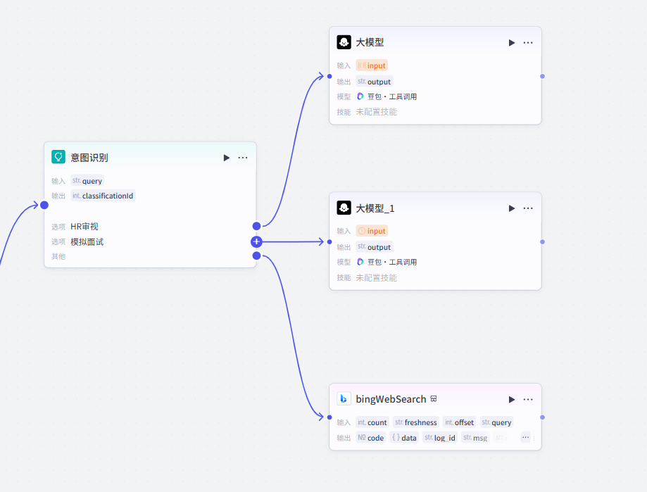 在工作流中的处理逻辑就是这样,意图识别下有三个分支,我们就可以对这三个分支分别进行后续工作节点的定义,直接在分支选项后面进行连线即可,这个连线可以使用工作流中的任何节点,包括但不限于常用的大模型、插件等等