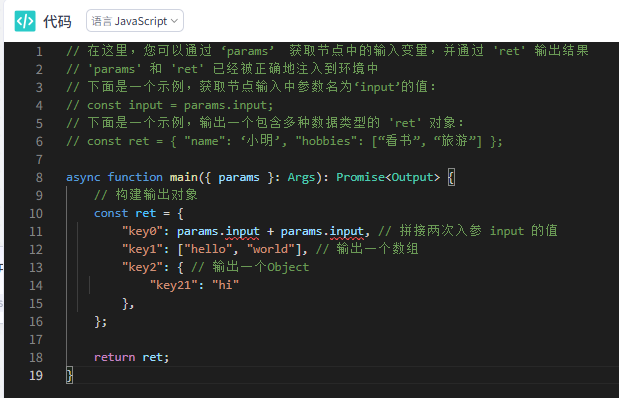 以拼接输入为例,代码节点可以使用Python代码实现。以下是一个示例代码: