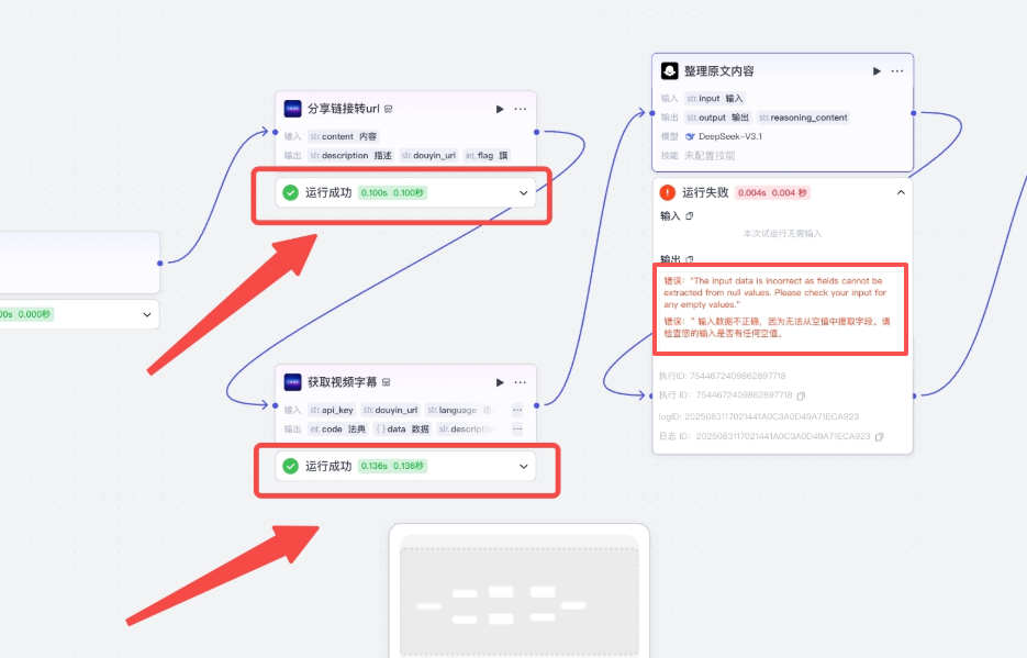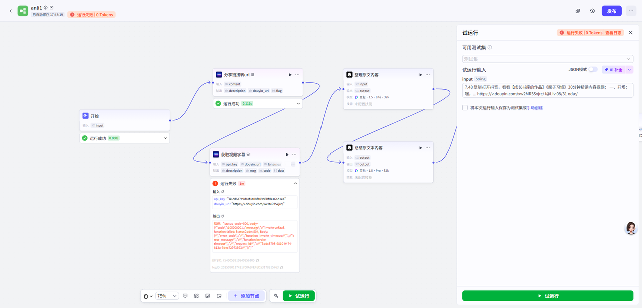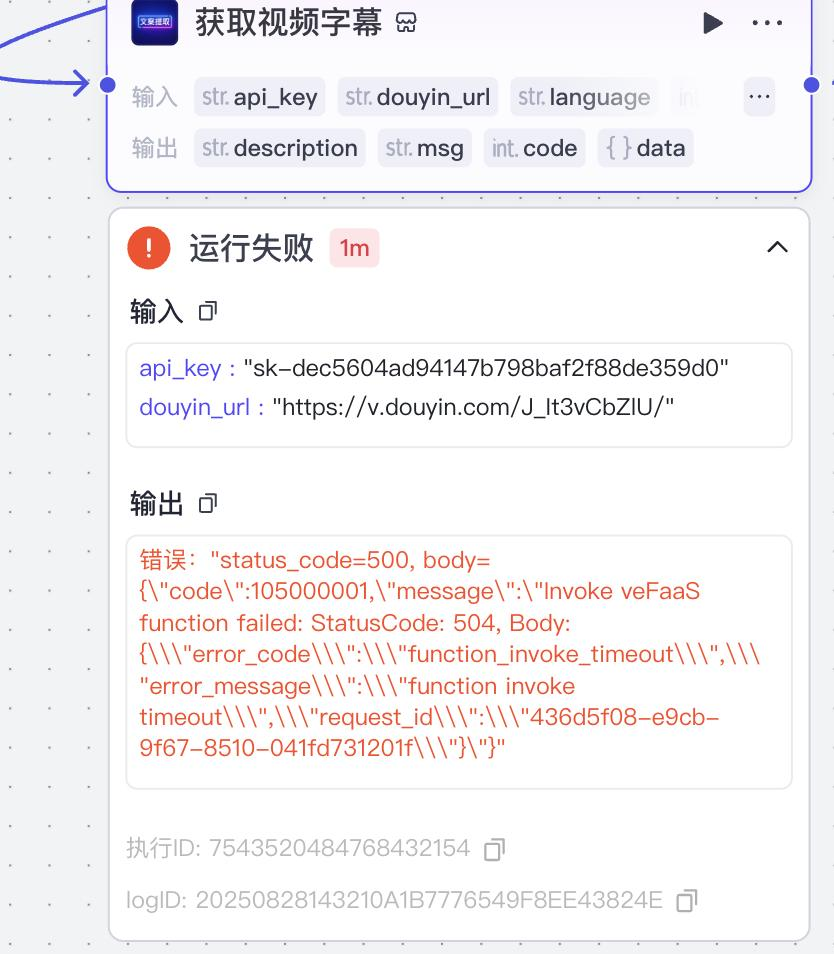 豆包回答超时,该工作流是用于提取抖音视频的字幕进行二创输出的,该节点是用于提取抖音视频的字幕的,这里超时就说明我们要求分析的视频太长了,导致它处理超时,我们需要换一个短视频,抖音毕竟是短视频平台,插件当然不支持处理太长的视频哦