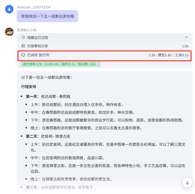 通过安装 “旅行师” 插件,智能体能够化身为保姆级旅游规划师,从衣、食、住、行等全方位为用户规划旅行方案,适用于用户计划出游的场景