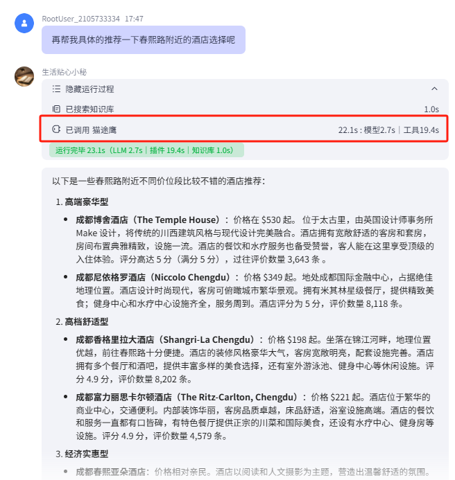 而 “猫途鹰” 插件,则让智能体可以在用户有住宿需求时,通过输入关键词来获取酒店数据列表,适用于商务出行或旅游出行时预订酒店的场景
