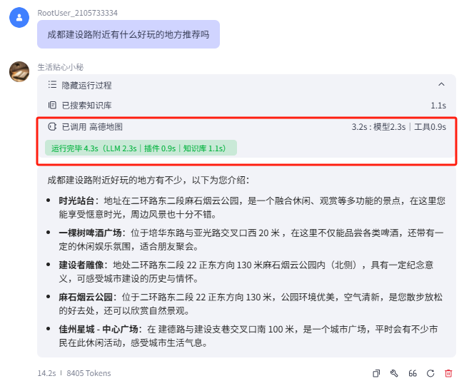“高德地图” 插件可让智能体搜索给定坐标附近的 POI 信息 ,帮助用户发现周边的各类场所,满足用户探索周边环境的需求