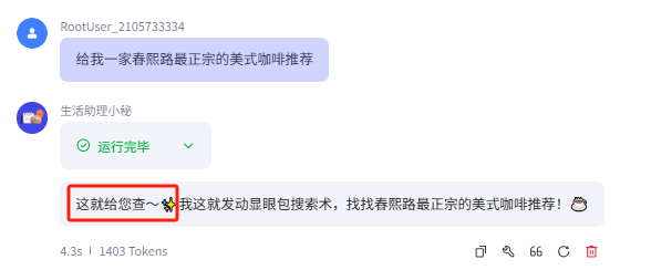 我们再正式一些,发言中出现了请,可以看到智能体已经启动商业模式,回答简练: