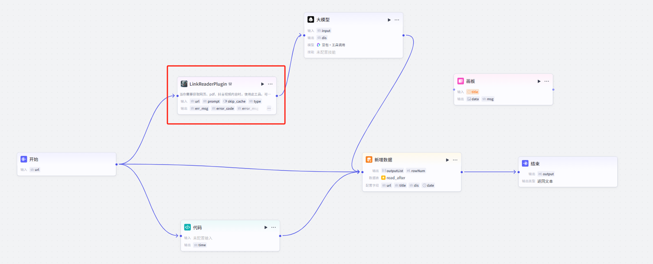 比如开始节点,接收用户的输入,以及后续的一些操作节点,这部分可能会包含大模型、插件、数据库输入输出、知识库检索,甚至是代码块等等