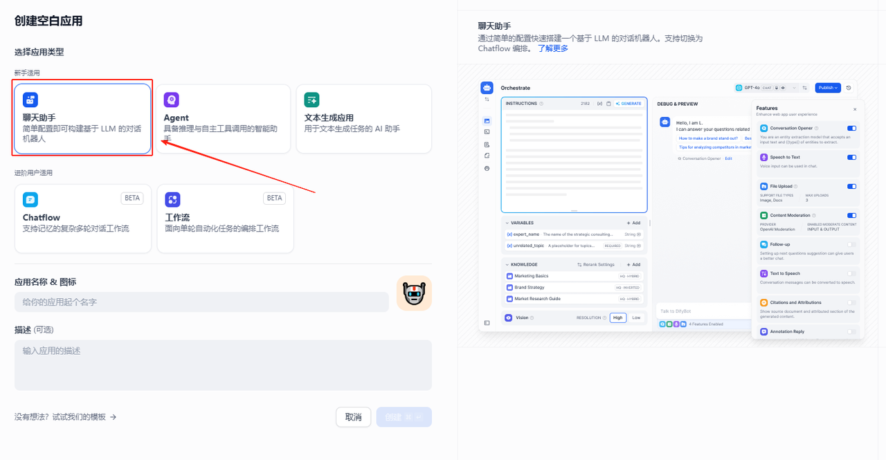 我们需要创建的是一个AI聊天助手,所以点击聊天助手