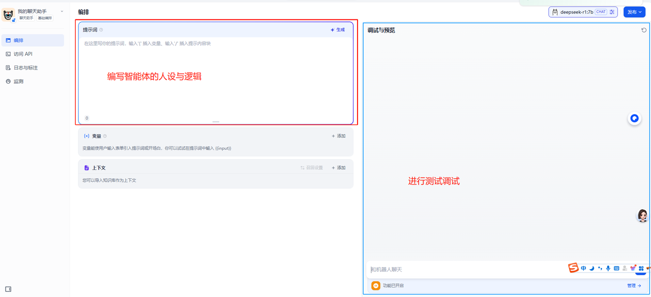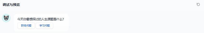 可以在提示词部分编写智能体的人设与逻辑,然后在蓝色部分进行测试和调试预览配置效果