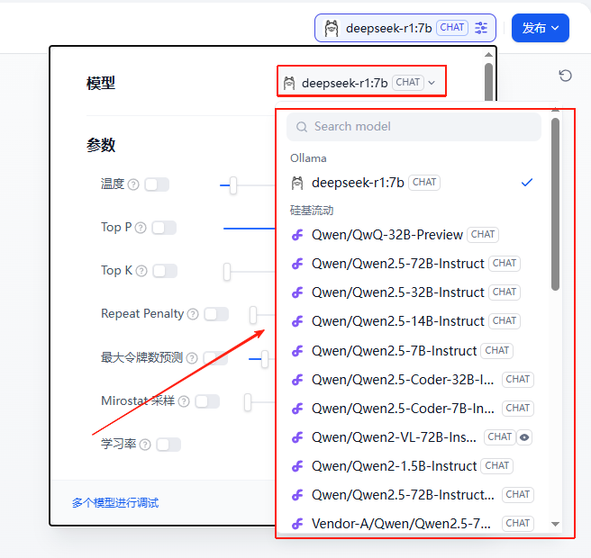再次点击一下弹窗中的大模型,可以进行模型的切换和选择,只可以选择自己已经配置好了的大模型哦