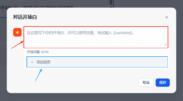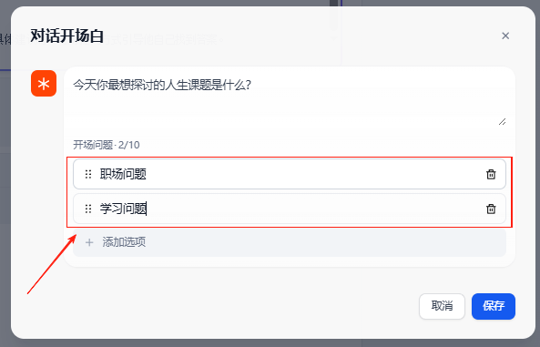 然后在弹出的界面输入开场白问题,同时还可以设置一些选项,达到辅助用户提问的效果