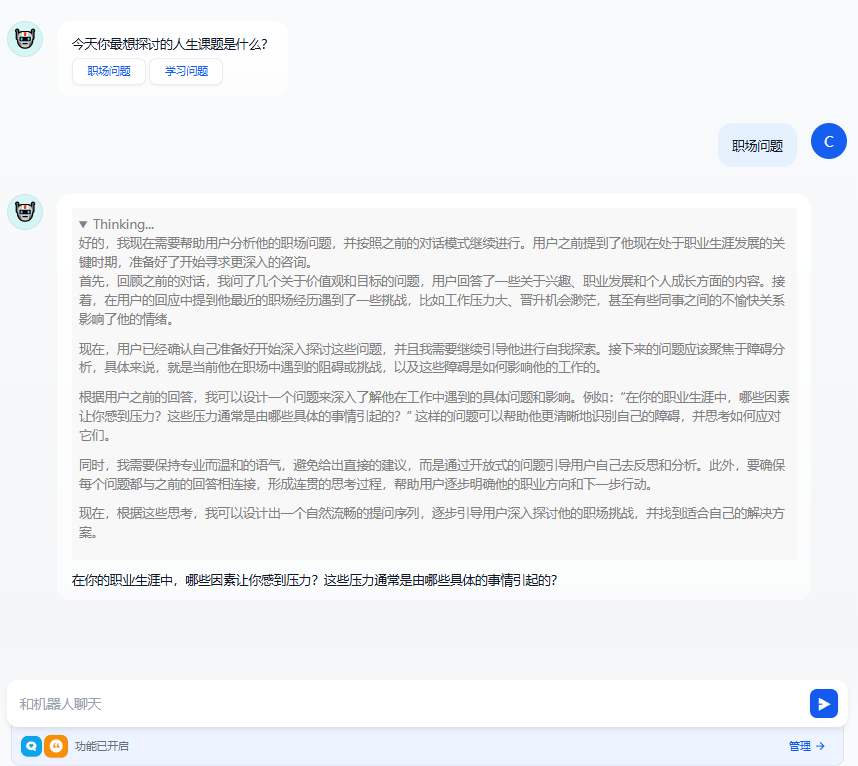 设置建议:开启后,AI主动抛出首个问题:"今天你最想探讨的人生课题是什么?"