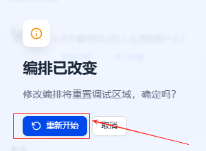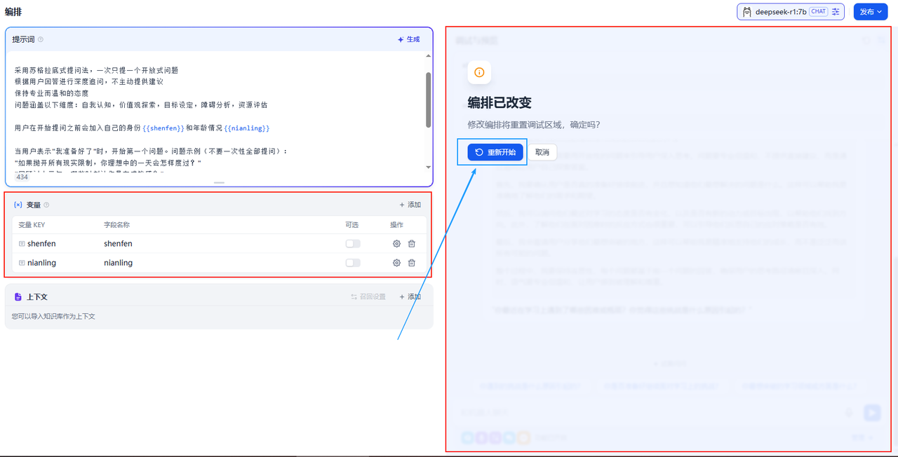 可以看到变量部分显示已经添加了两个变量,测试预览部分也显示编排已改变,点击一下蓝色按钮重新开始