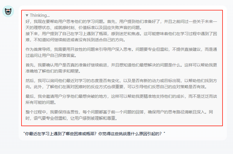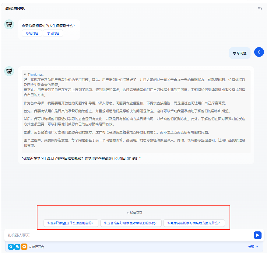 我们简单对话测试一下,可以看到聊天助手进一步提出了问题,引导我们继续回答