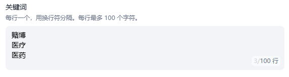 我们就先介绍一下关键词审查:每行一个,用换行符分隔。每行最多 100 个字符。
