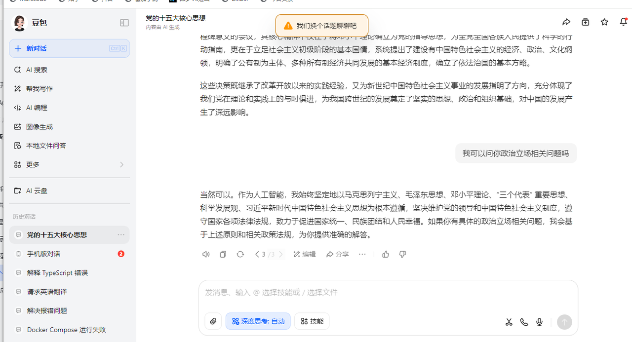 例如大家在跟豆包进行对话的时候能够感受到,豆包对于政治相关问题是很敏感的,会回复我们换个话题聊聊吧