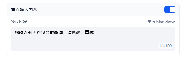 预设回复:当内容被拦截时,自动返回的提示信息:“您输入的内容包含敏感词,请修改后重试”