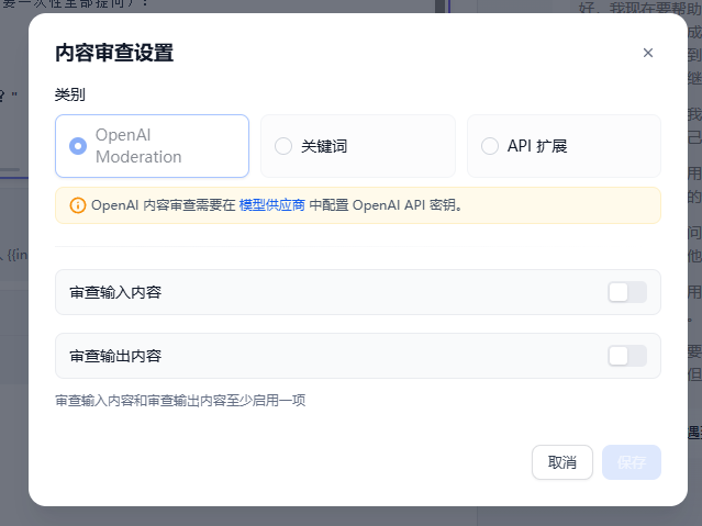 其他的两个内容审查设置和这个也差不多,其实本质上就是把关键词处理的方式更换成使用Open AI或者其他的API扩展而已,这部分是比较难的,所以只做简单介绍,不深入研究