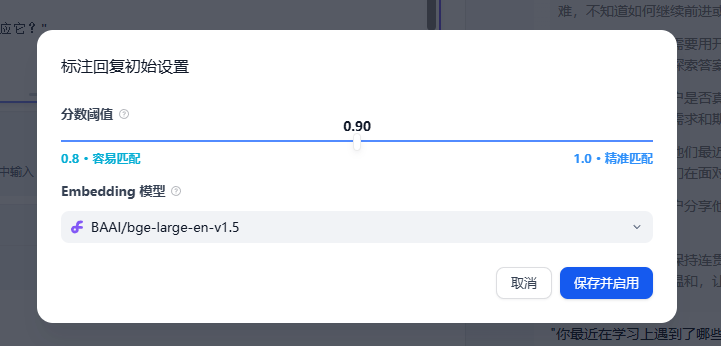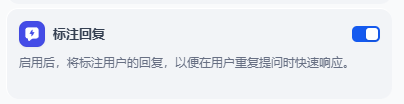 当用户 重复提问相同或类似问题 时,系统能快速识别并直接调用之前标记过的回答,避免重复生成内容,提升效率,启用后,系统会优先检索已标注的回复库,而非每次都调用AI生成