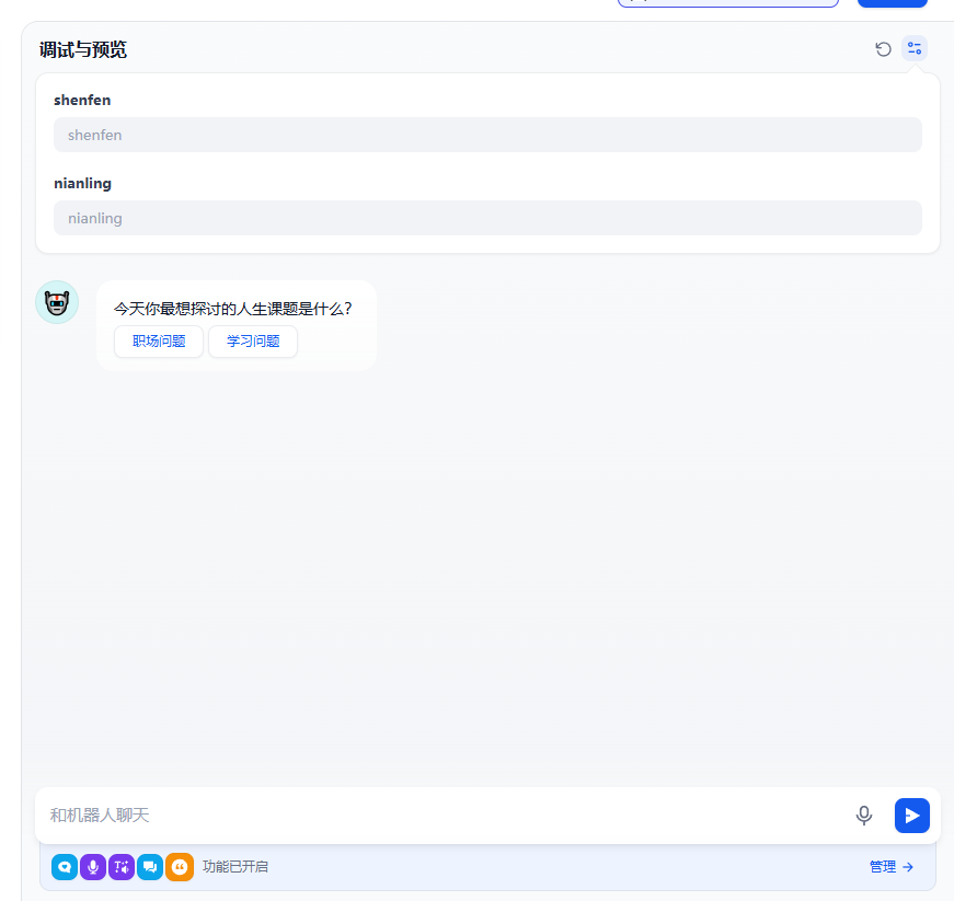 这样我们就完成了一个简单的聊天助手的配置,并且可以看到右下角还有一个管理按钮,我们点击一下看看